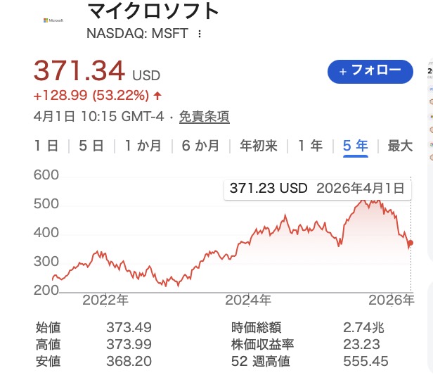 とのことで、今、マイクロソフトの株価が370ドルあたり。